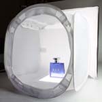 The paper should continue on up following the curve of the sweep, creating a seamless black background. Add one light source from behind the EZcube®, be sure to shoot over the top of the paper just a little. This will help illuminate the upper rim. Photograph with a digital camera on a tripod to avoid motion blur. Ste the aperture at f 8.0 for a maximum depth of field,  with a exposure compensation of E.V. -0.7 to darken the background still more.