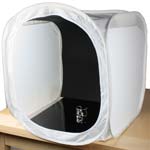 | The reason we often times choose to work with a light tent is because it can provide fast and easy soft lighting, instantly provides a clutter free background along with convenient backdrop support. The Tabletopstudio EZcube's have evolved over time with significant changes made to the design from feedback gathered at countless hours of jewelry photography workshops held in partnership with Brooks Photography Institute. Some of the modifications includes new ways to hang or suspend items more easily inside the tent as well as accessories designed to work with the new EZcube features like acrylic rods that can be suspended inside by the new built-in grommet strips lining the top inside. |