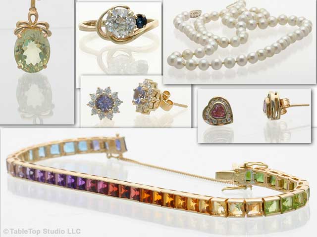 The primary light source for the necklace shown, was positioned on the side of the table, facing downward toward the jewelry and table surface. A single soft box was used to soften the primary light source and prevent glare and hotspots on the surface of the crystals. We used one single 20" x 20" Kuhl Lite 120 soft box for this. This light holds four 30 Watt The large acrylic sheet used, has a protective sheet on both sides; we highly recommend leaving the second side covered with the protective sheeting until you intend to use it. The acrylic does scratch easily, so dragging jewelry across the surface is to be avoided when at all possible. Glass is more durable and can be used instead of acrylic; however it is more hazardous to work with due to the fragile nature of glass. This technique works especially well for jewelry that lies flat like the necklace shown. Because this is an open set and the black acrylic is highly reflective, it will take some patience to line things up just right so the acrylic is not reflecting things you do not wish to see in your image. If you have the opportunity to work in an area with high ceilings, that helps to reduce the overhead reflections a bit. Be sure to keep looking through the camera lens after repositioning any part of the setup. Unwanted reflections have a way of sneaking in just when you think you're all set. Be sure that all of your lights match in color or you will not be happy with the results. NEVER mix different light source bulb colors. I use all 5000K daylight balanced bulbs for all of my example images. |