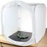 | The reason we often times choose to work with a light tent is because it can provide fast and easy soft lighting, instantly provides a clutter free background along with convenient backdrop support. The Tabletopstudio EZcube's have evolved over time with significant changes made to the design from feedback gathered at countless hours of jewelry photography workshops held in partnership with Brooks Photography Institute. Some of the modifications includes new ways to hang or suspend items more easily inside the tent as well as accessories designed to work with the new EZcube features like acrylic rods that can be suspended inside by the new built-in grommet strips lining the top inside. |